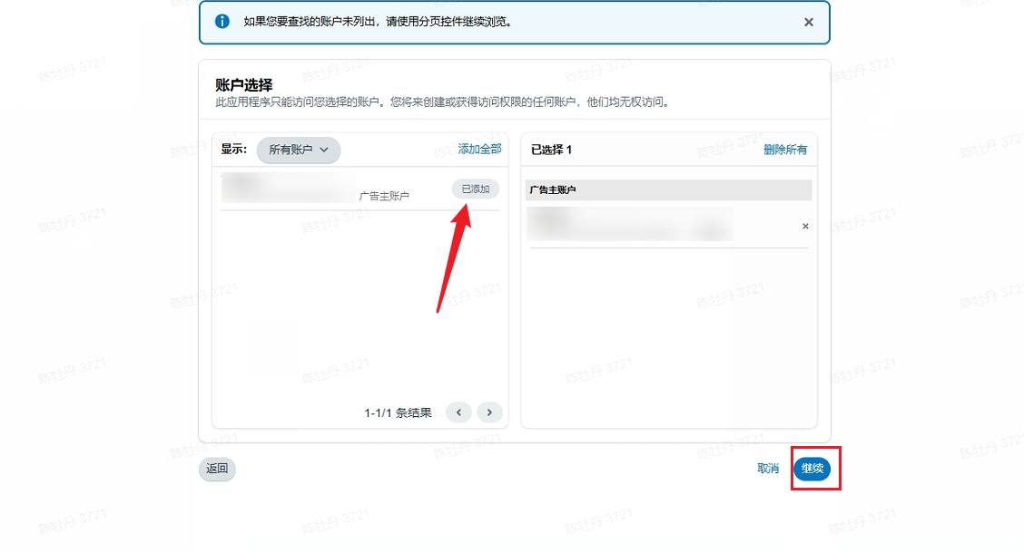 如果选择【仅限选定账户】选项,然后点击【继续】按钮,则会出现广告账户选择列表,需要确认并勾选当前需要授权的广告账户
