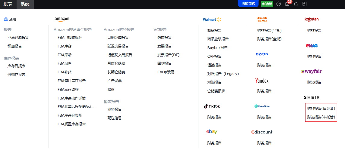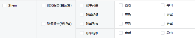 注意:SHEIN财务报告默认授权给了系统管理员,如需使用,请联系系统管理员开启菜单权限(路径:系统-菜单权限-功能权限-报表-SHEIN-自运营/半托管-财务报告)。