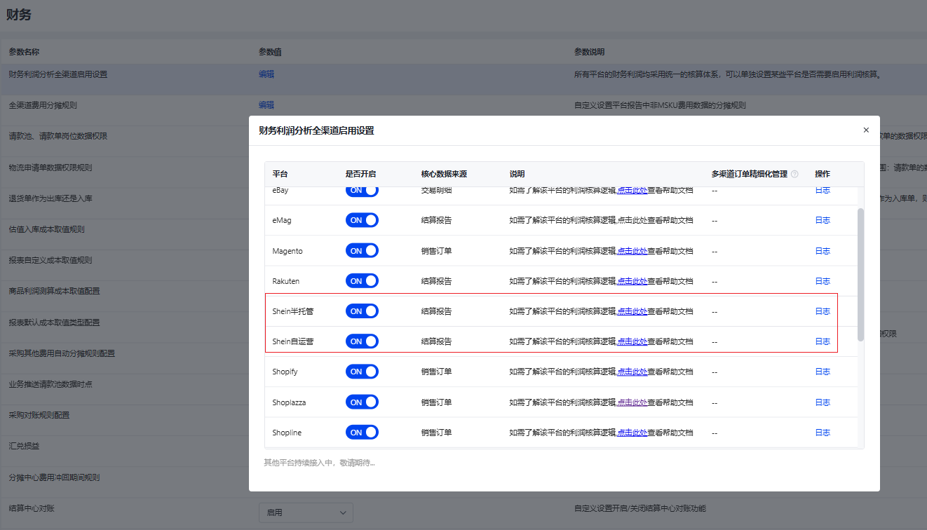 SHEIN财务报告的数据主要应用于财务利润分析,请在[财务利润全渠道启用设置]参数中去开启即可。