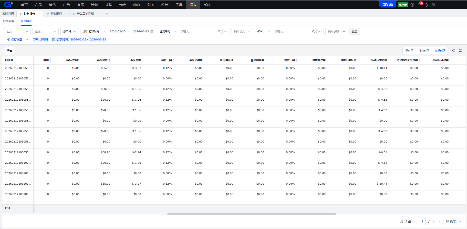 为了方便跟后台数据进行核对,请在ERP店铺授权模块将时区设置与店铺后台一致,后续利润核算时也是基于此时区转换出的市场时间进行统计。