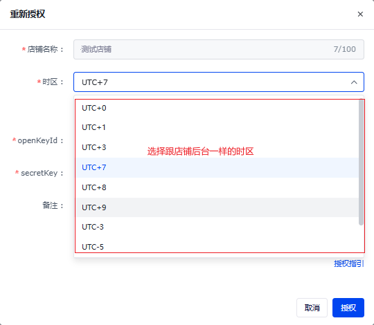 自运营店铺在ERP店铺授权模块操作列点重新授权,其他信息请勿调整,仅调整时区即可。