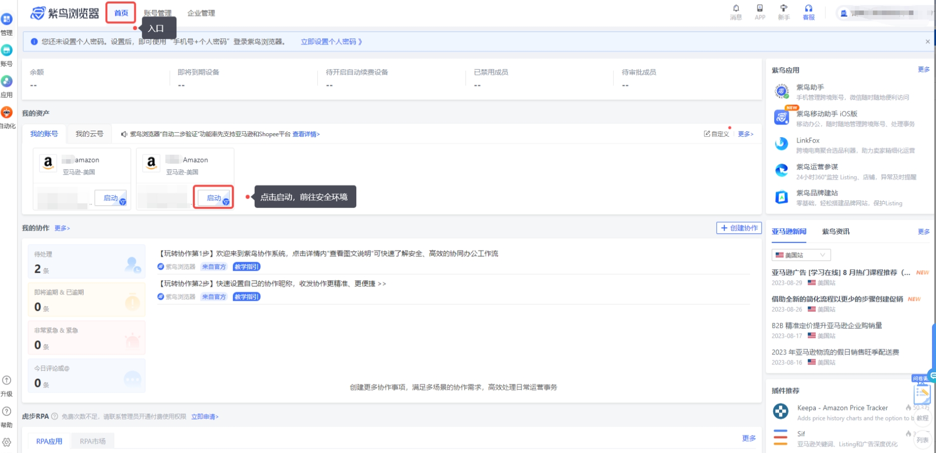 (3)在首页启动我的亚马逊账号,紫鸟浏览器会打开新的网页