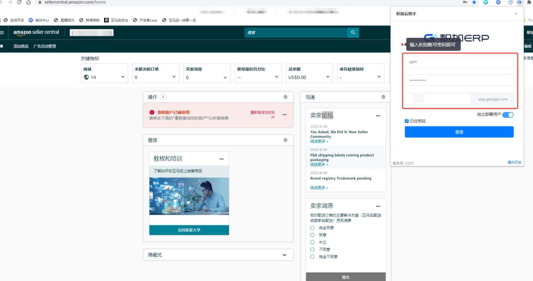 谷歌浏览器:用户登录亚马逊登录卖家中心+添加插件并登录积加账号;
