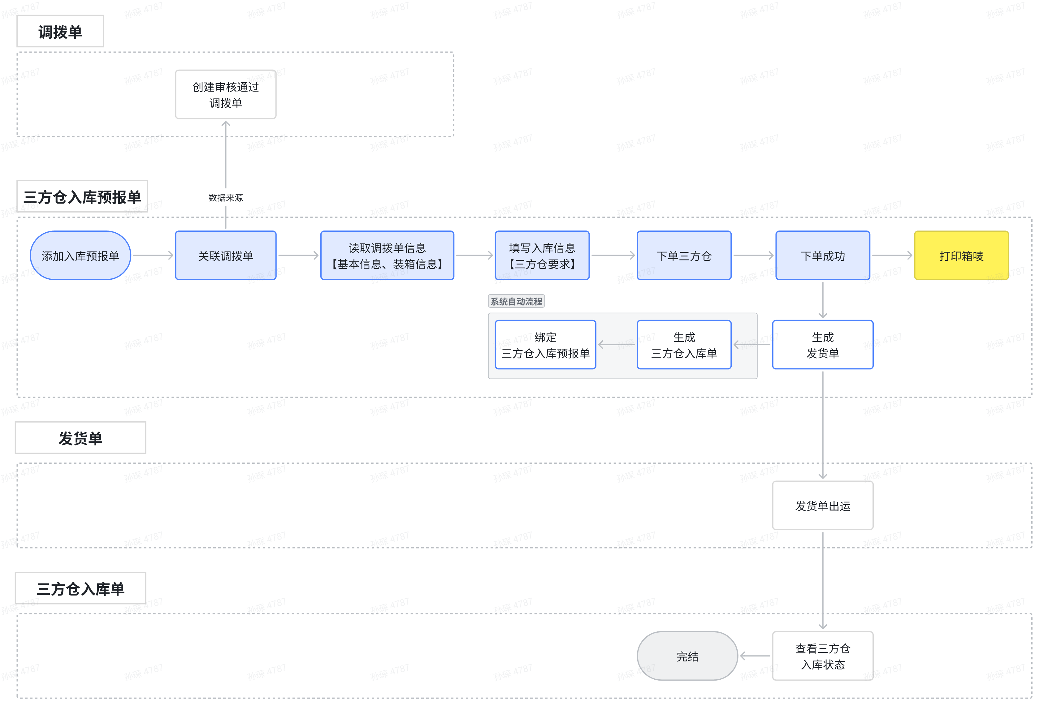 发货单生成后,系统会自动调用【下单到三方仓】操作生成对应的三方仓入库单号并绑定已提前下单的三方仓入库预报单号,无需再重新下单到三方仓。