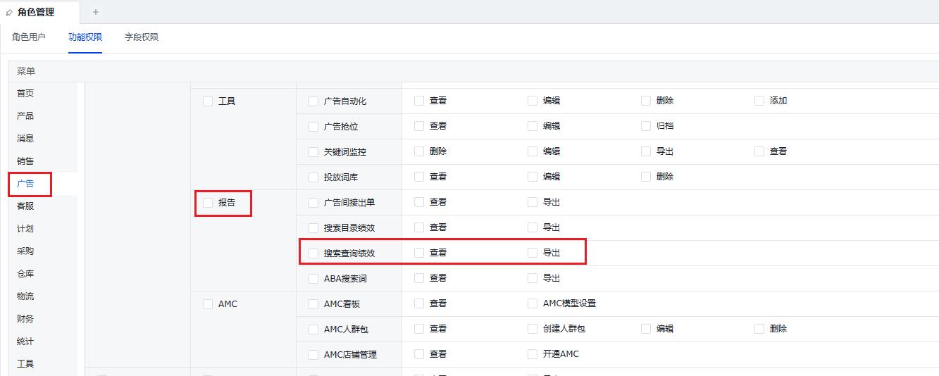 菜单权限资源包括:查看、导出,需要先前往【系统-权限管理-角色管理】销售菜单下开通相关功能
