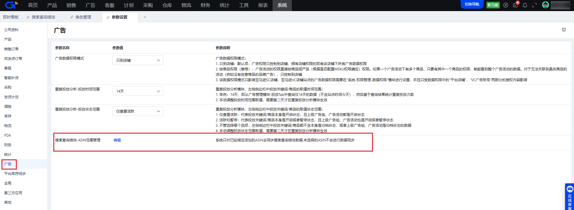 请到【系统-基础配置-参数设置:广告】路径下检查【搜索查询绩效-ASIN范围管理】中是否存在ASIN1