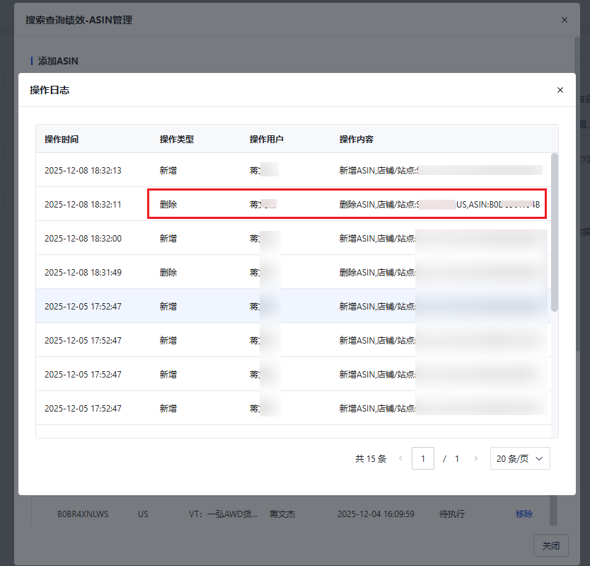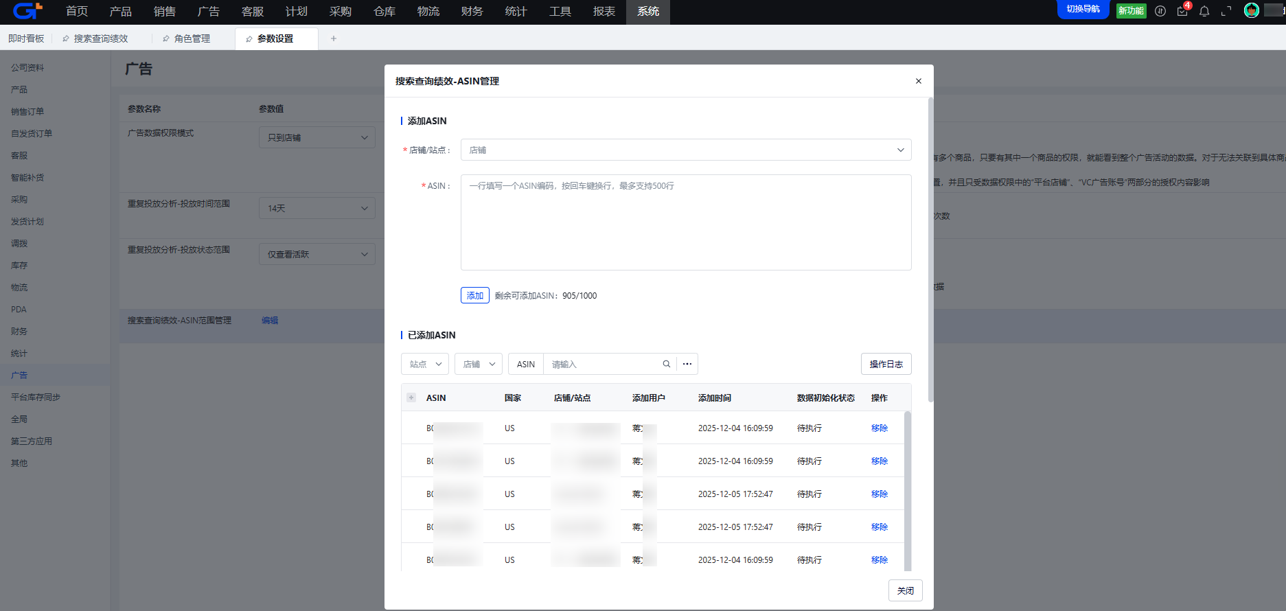 请到【系统-基础配置-参数设置:广告】路径下【搜索查询绩效-ASIN范围管理】弹窗中,点击【日志】按钮,检查是否曾经录入过这个ASIN2,但是后面又移除了。