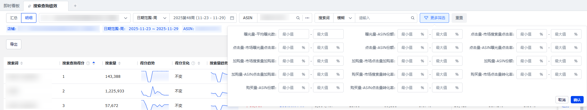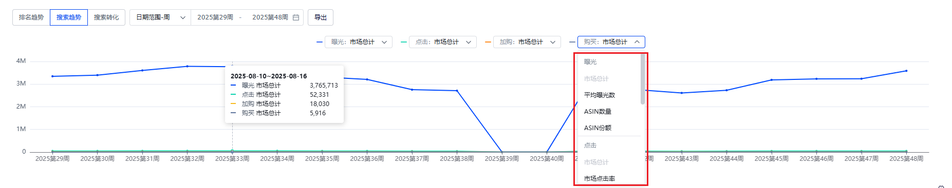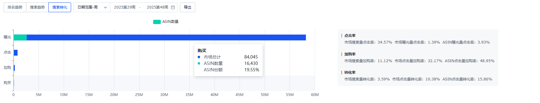 展示查询时间范围下,曝光、点击、加购、购买(即转化)的整体漏斗情况,支持市场与ASIN份额对比查看