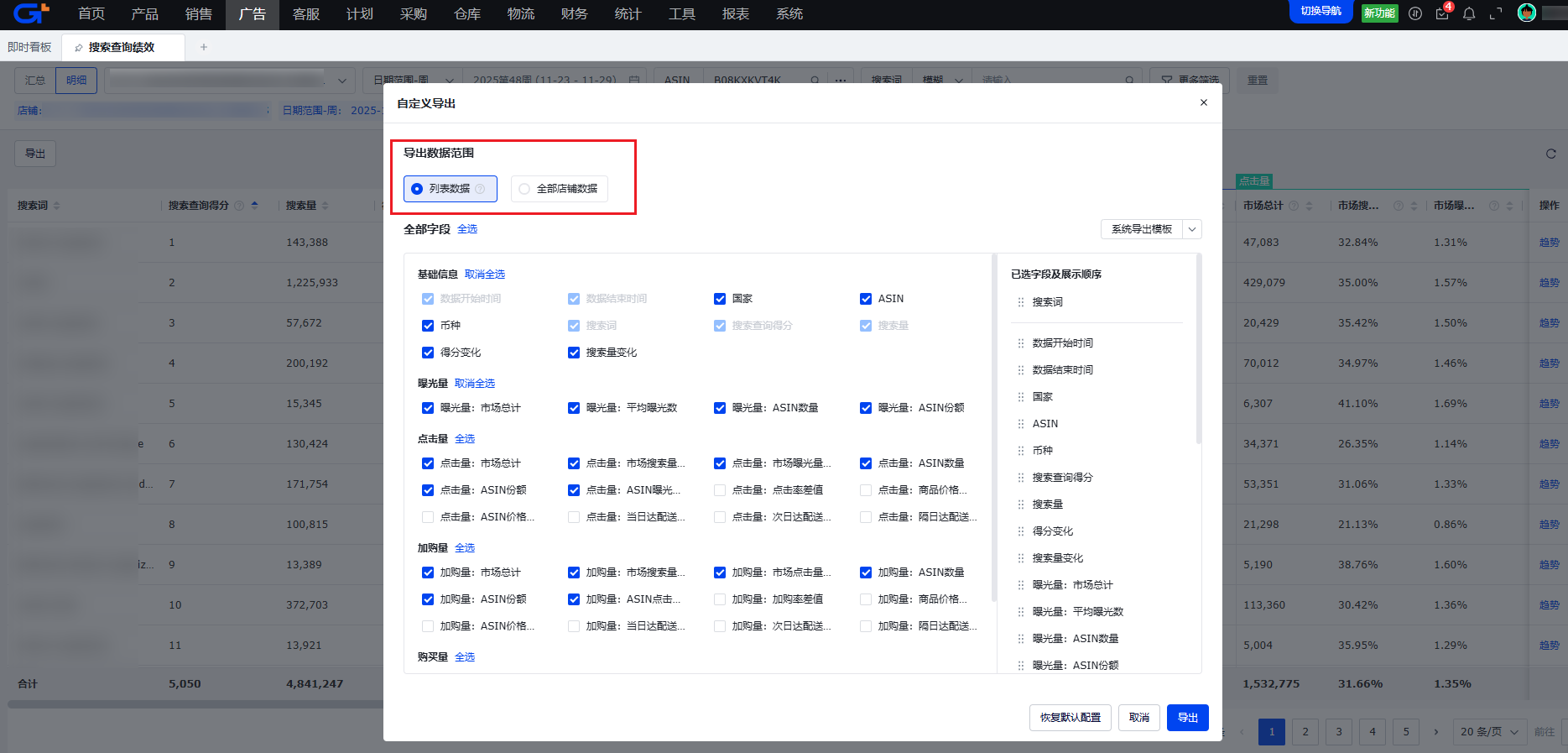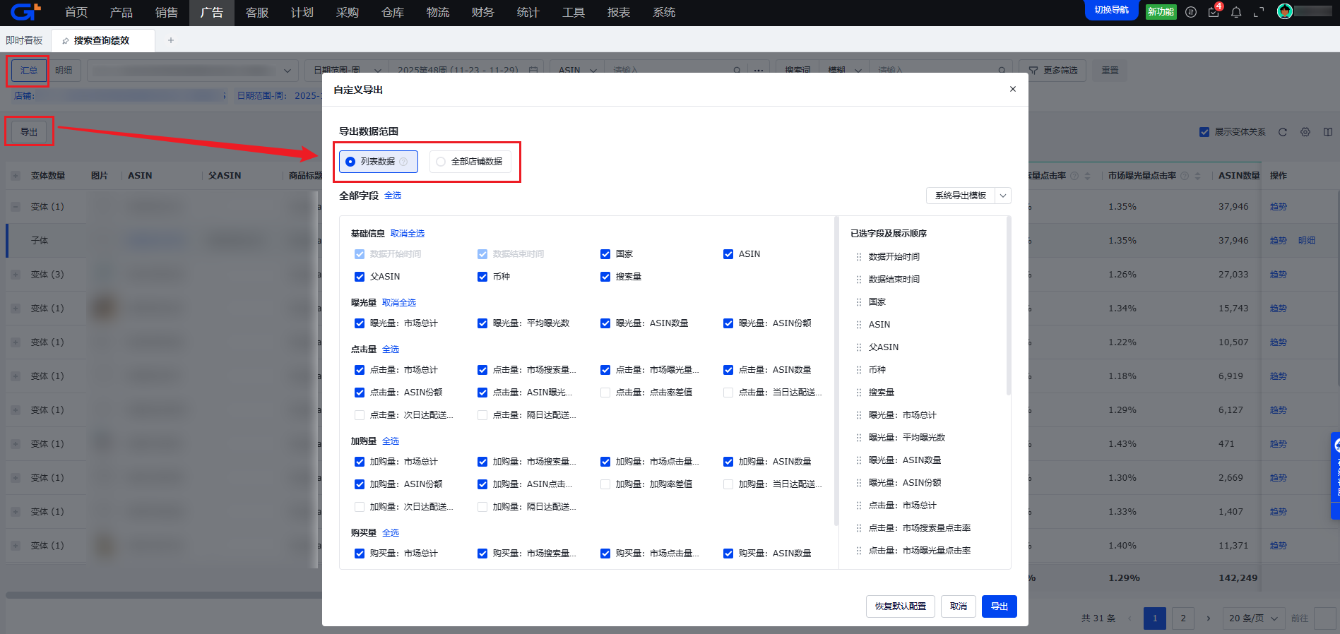 导出范围:支持【列表数据】和【全部店铺数据】两种范围设置;