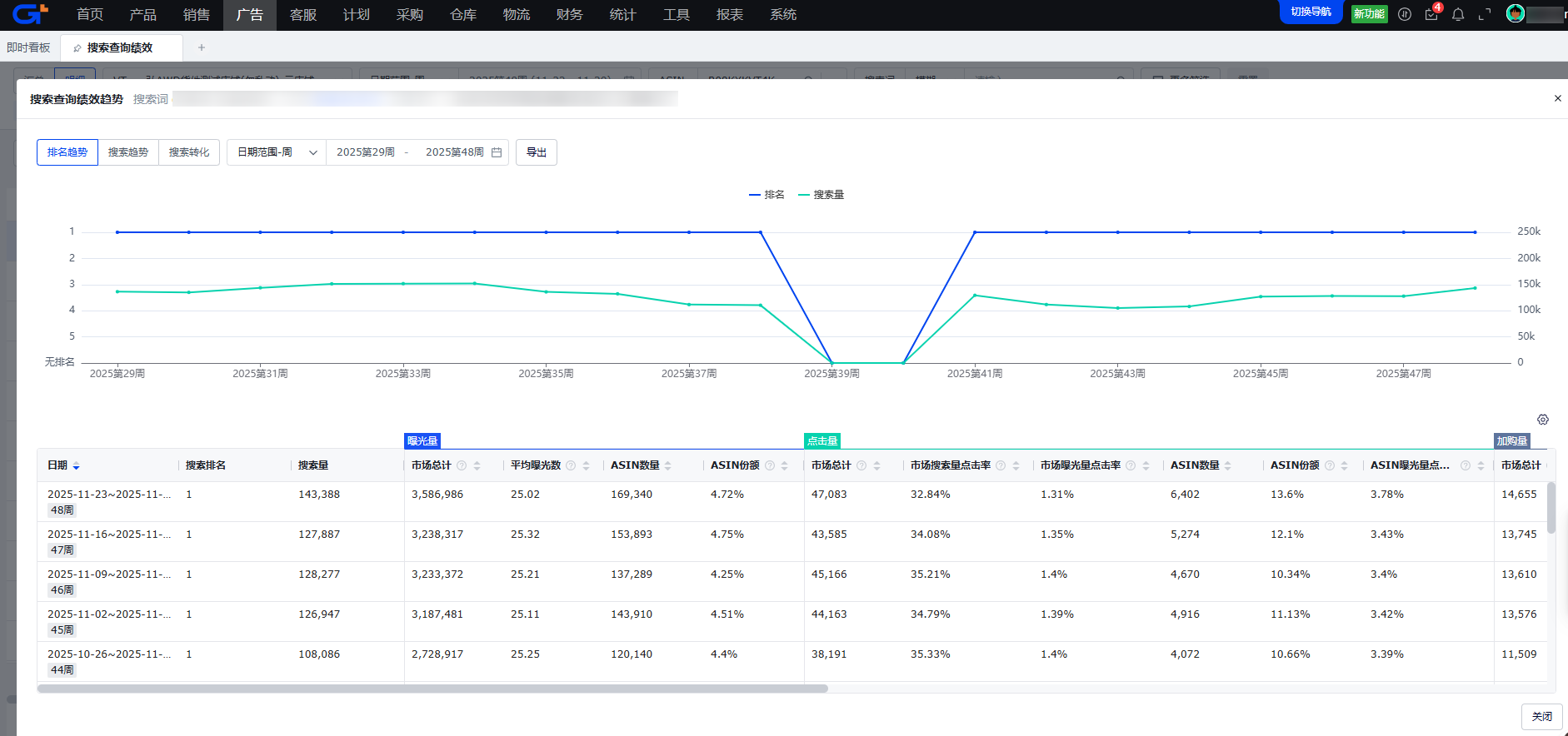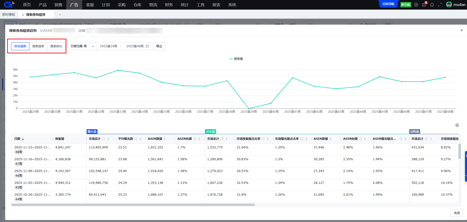 点击趋势按钮,则展示对应数据行对象(ASIN或者父ASIN)下所有关键词汇总后的趋势弹窗,也包括排名趋势、搜索趋势、搜索转化三个趋势图和列表数据