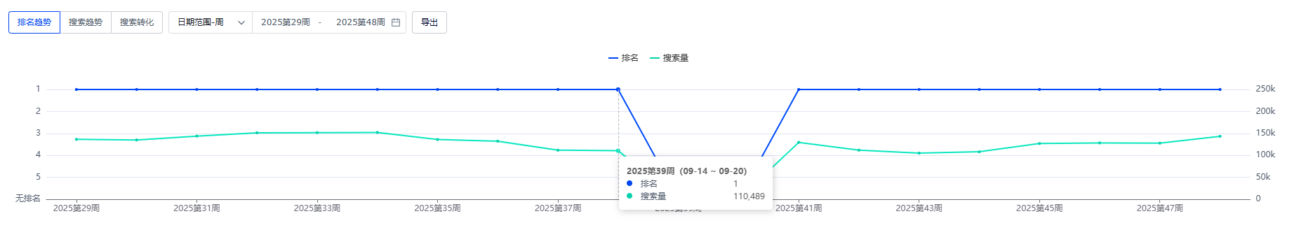 只展示搜索排名(即搜索查询得分)和搜索量两个指标