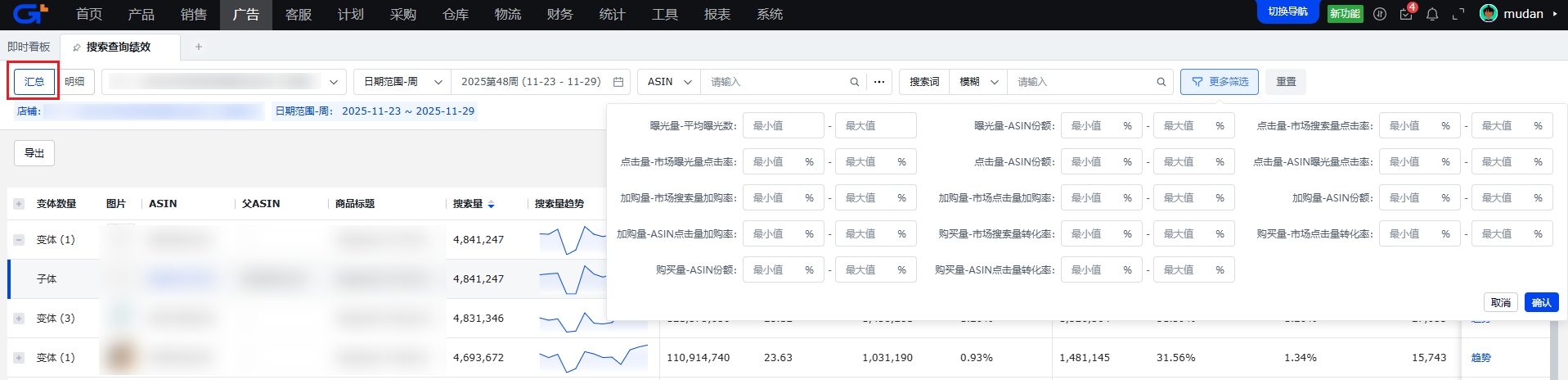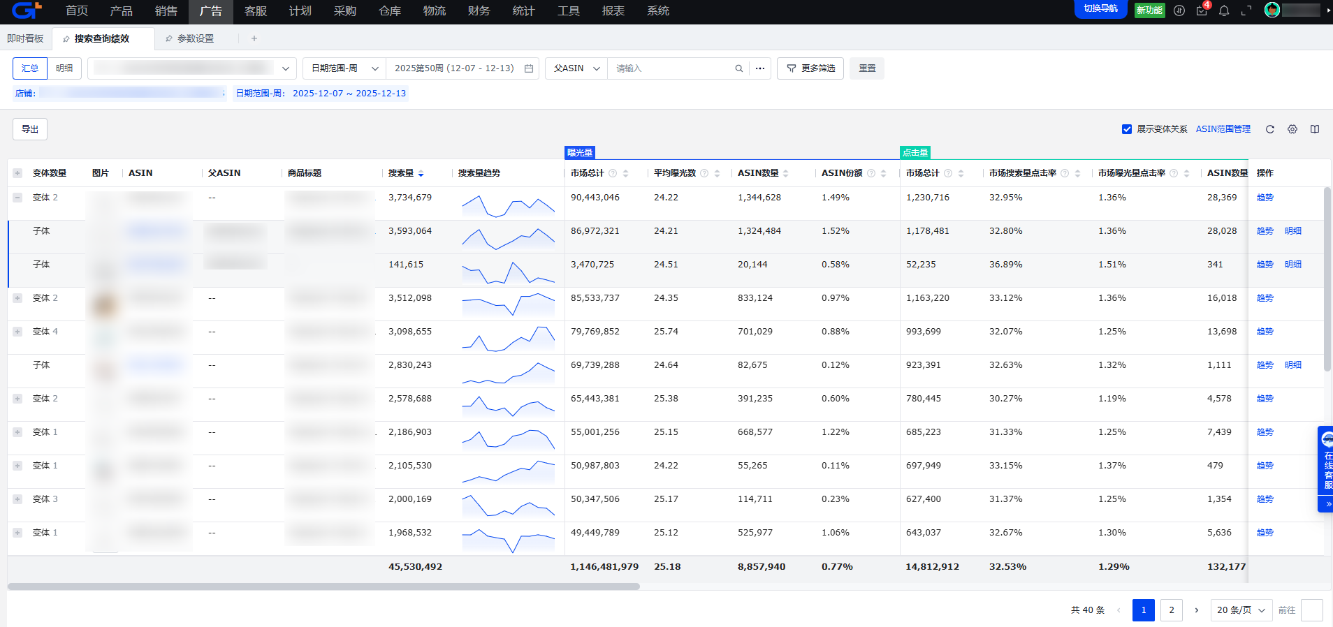 系统根据明细数据、按店铺站点+ASIN分组汇总统计所得,支持按子ASIN或者按变体关系展示。