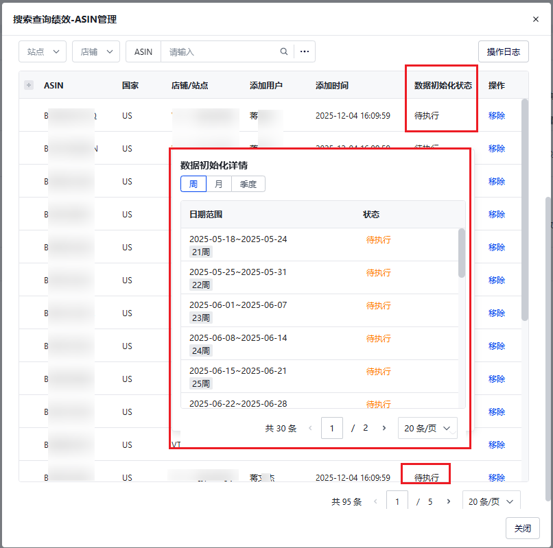 由于接口存在限流,所以系统会分时间、分批请求数据,要完成历史数据初始化预计会要1周左右;初始化的具体进度可以在【搜索查询绩效-ASIN范围管理】弹窗的ASIN列表中查看