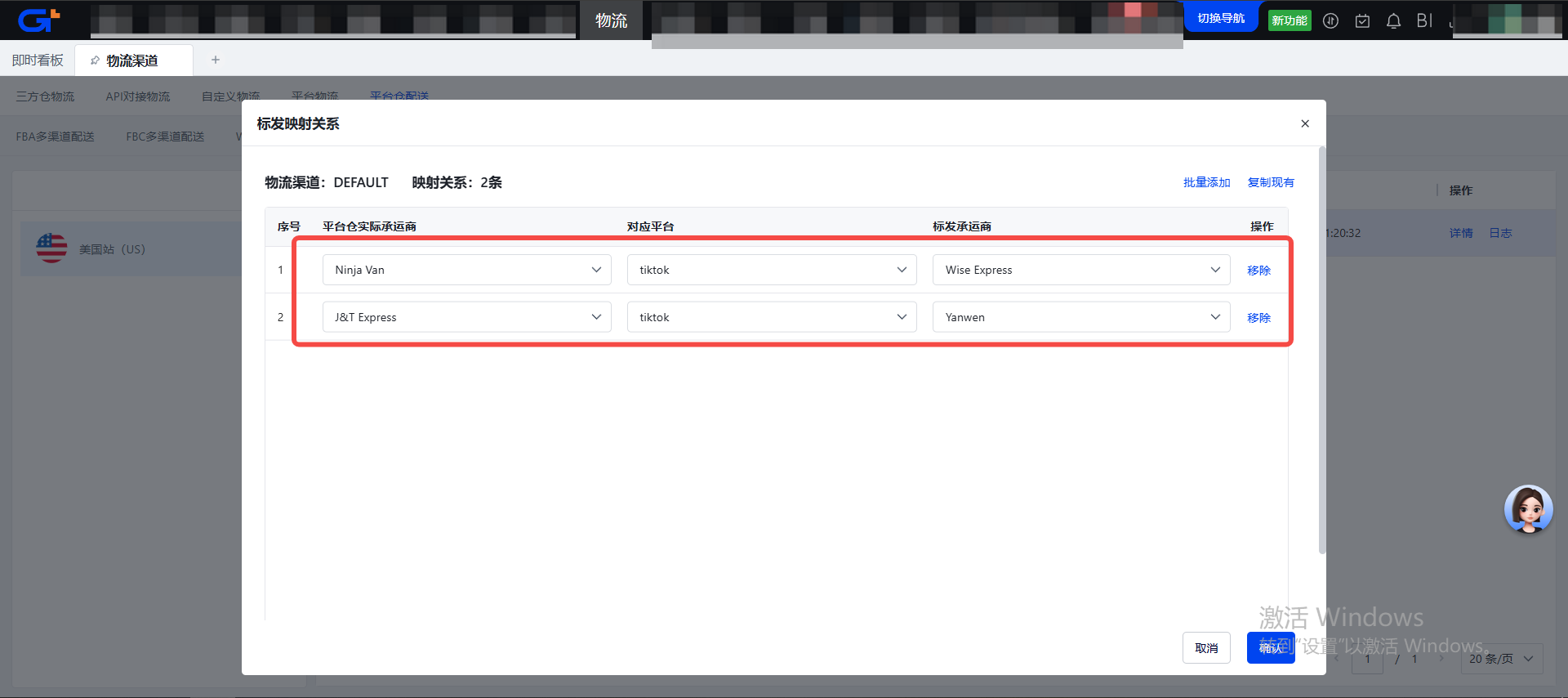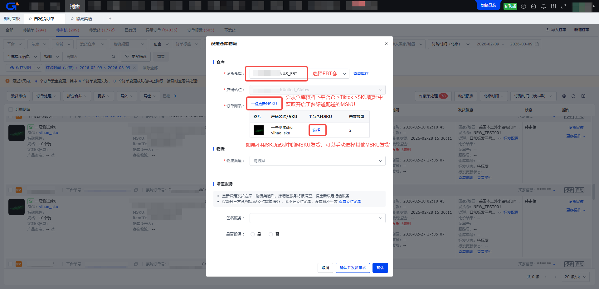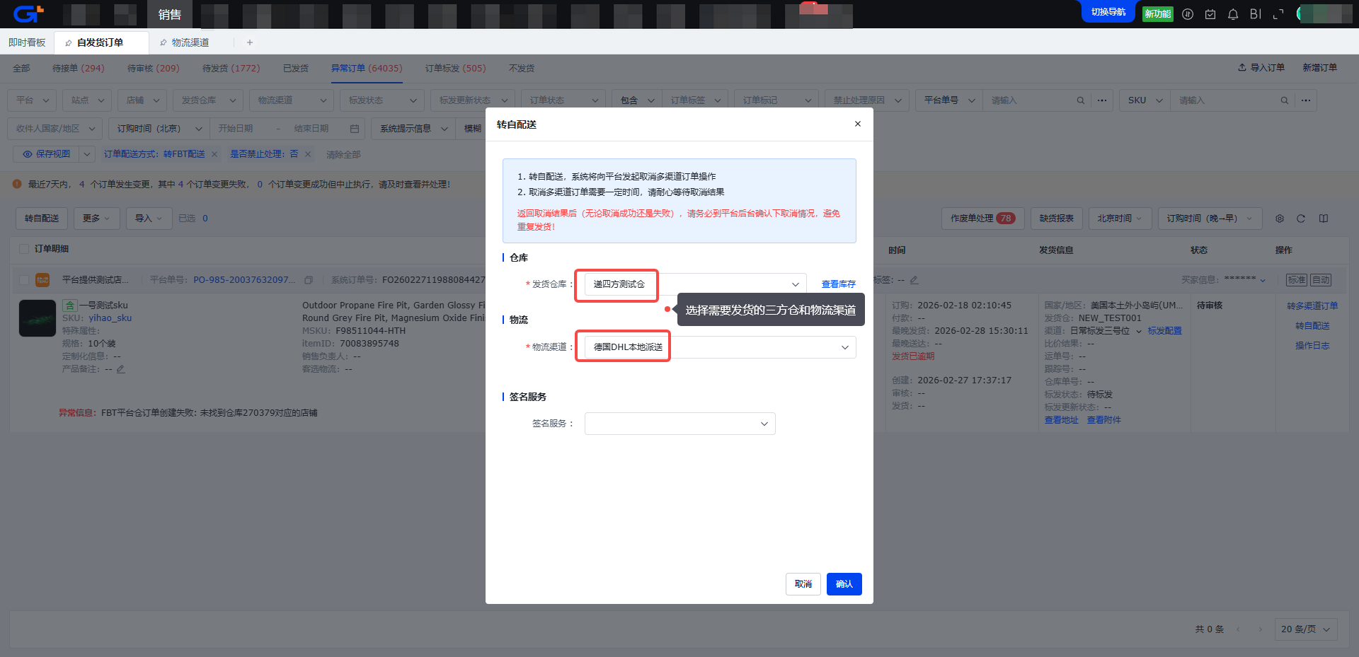 步骤二:点击操作栏中的【转自配送】按钮,选择【发货仓库】【物流渠道】,点击【确认】按钮,系统会先取消FBT仓的多渠道订单