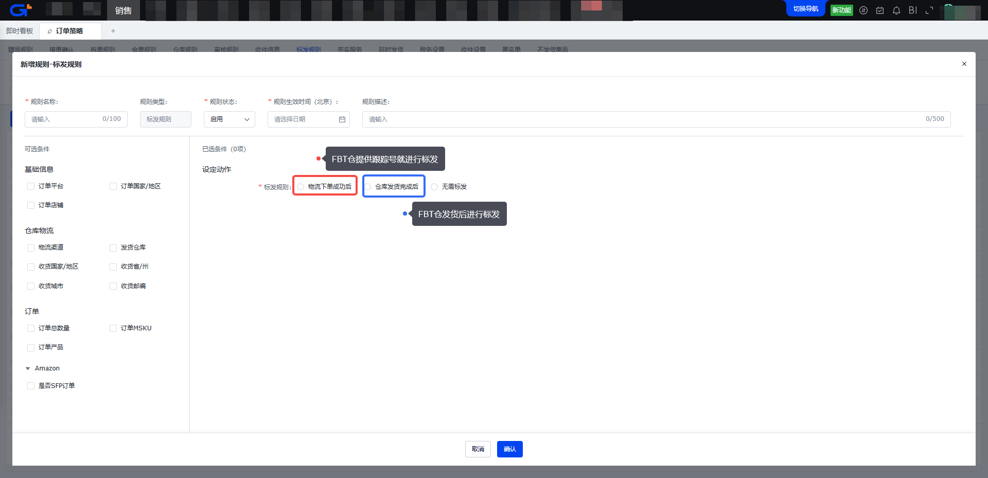 步骤六:系统自动执行标发规则。如果选择【物流下单成功后标发】:则查询到跟踪号立即标发平台;如果选择【仓库发货完成后标发】:则查询到跟踪号并且订单状态为已发货时标发平台。