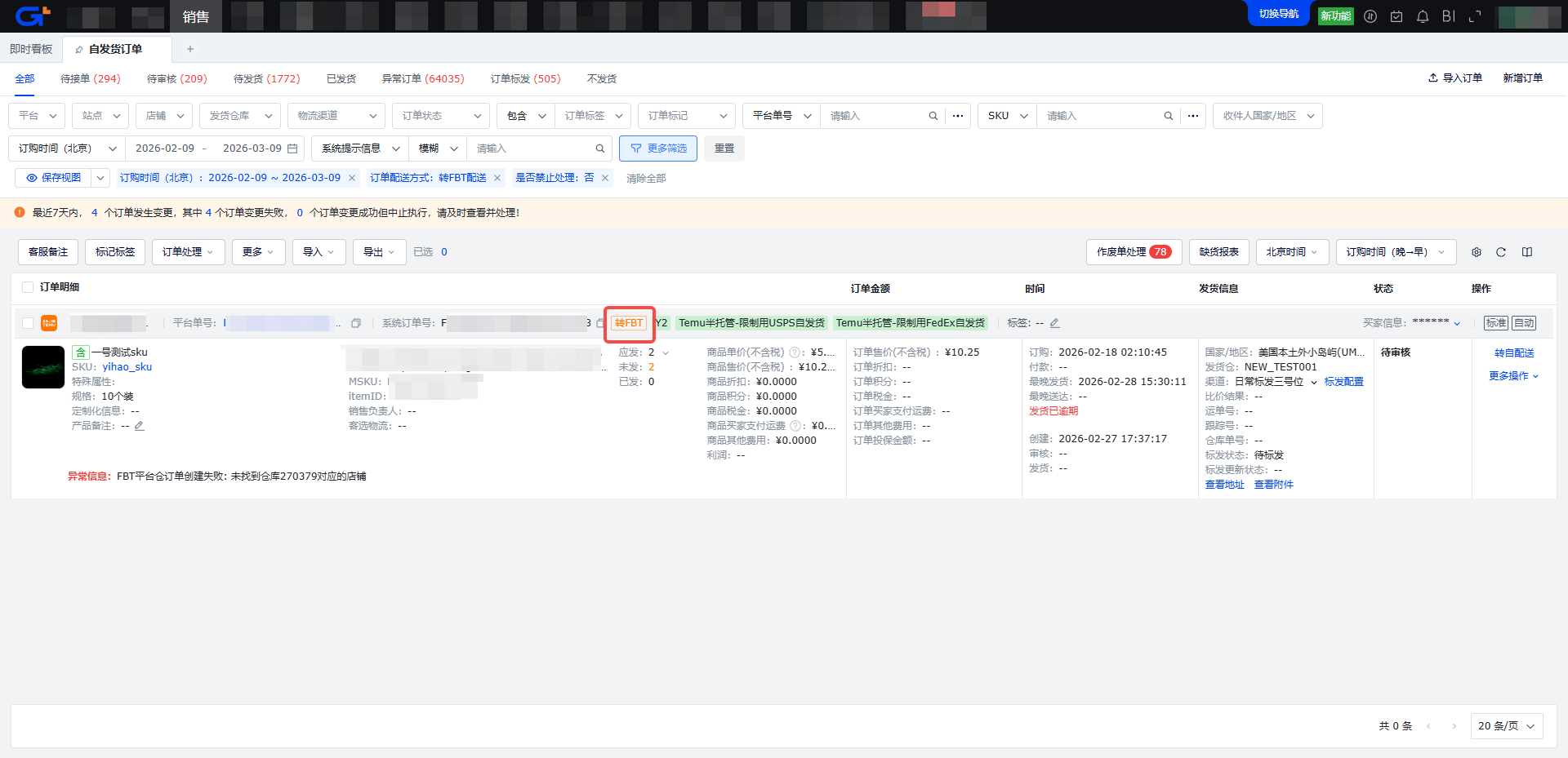 步骤一:在【异常订单->转平台仓创建失败】页面找到推送失败的订单(可以通过查询条件->订单配送方式:【转FBT配送】查找)