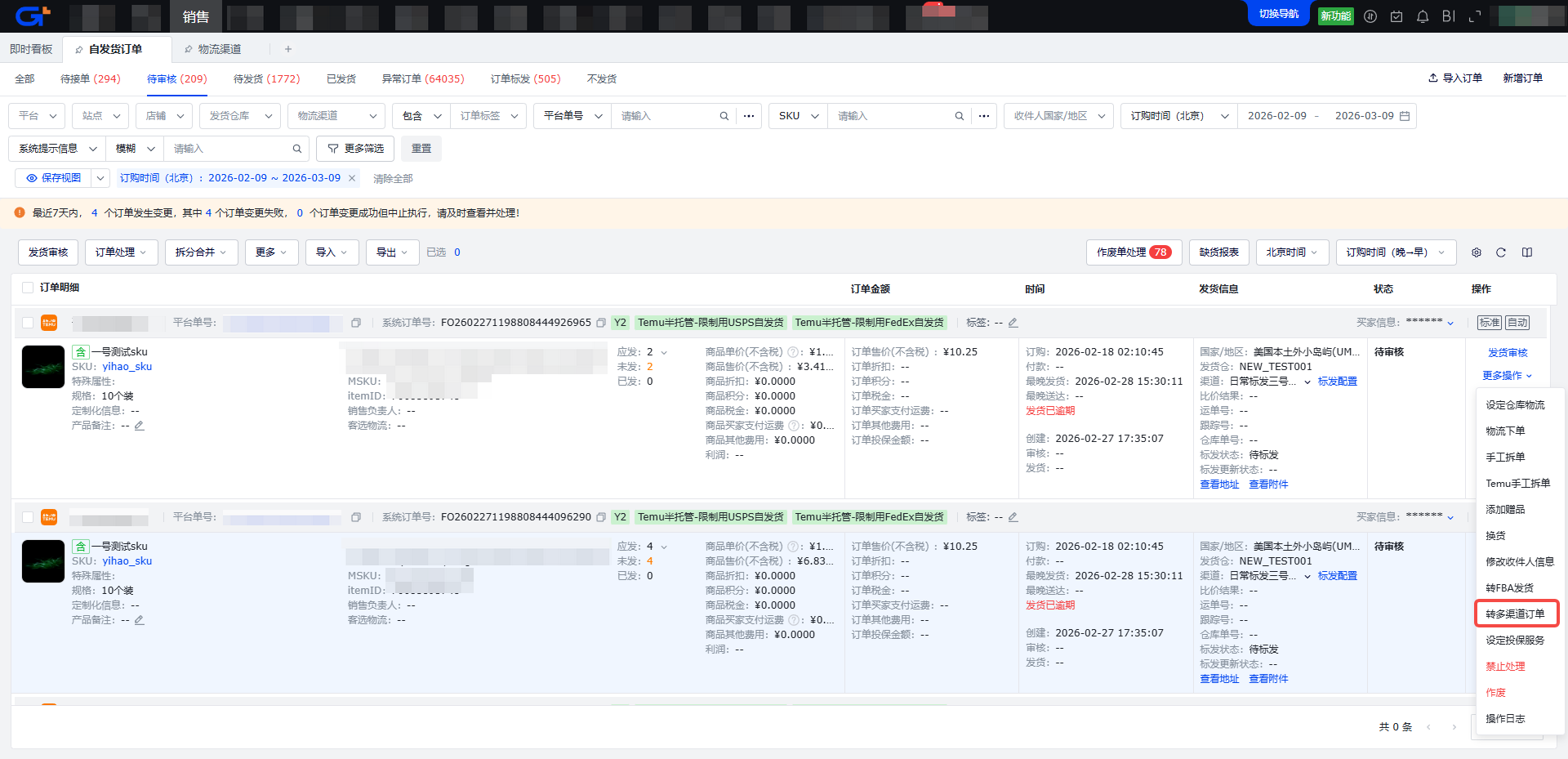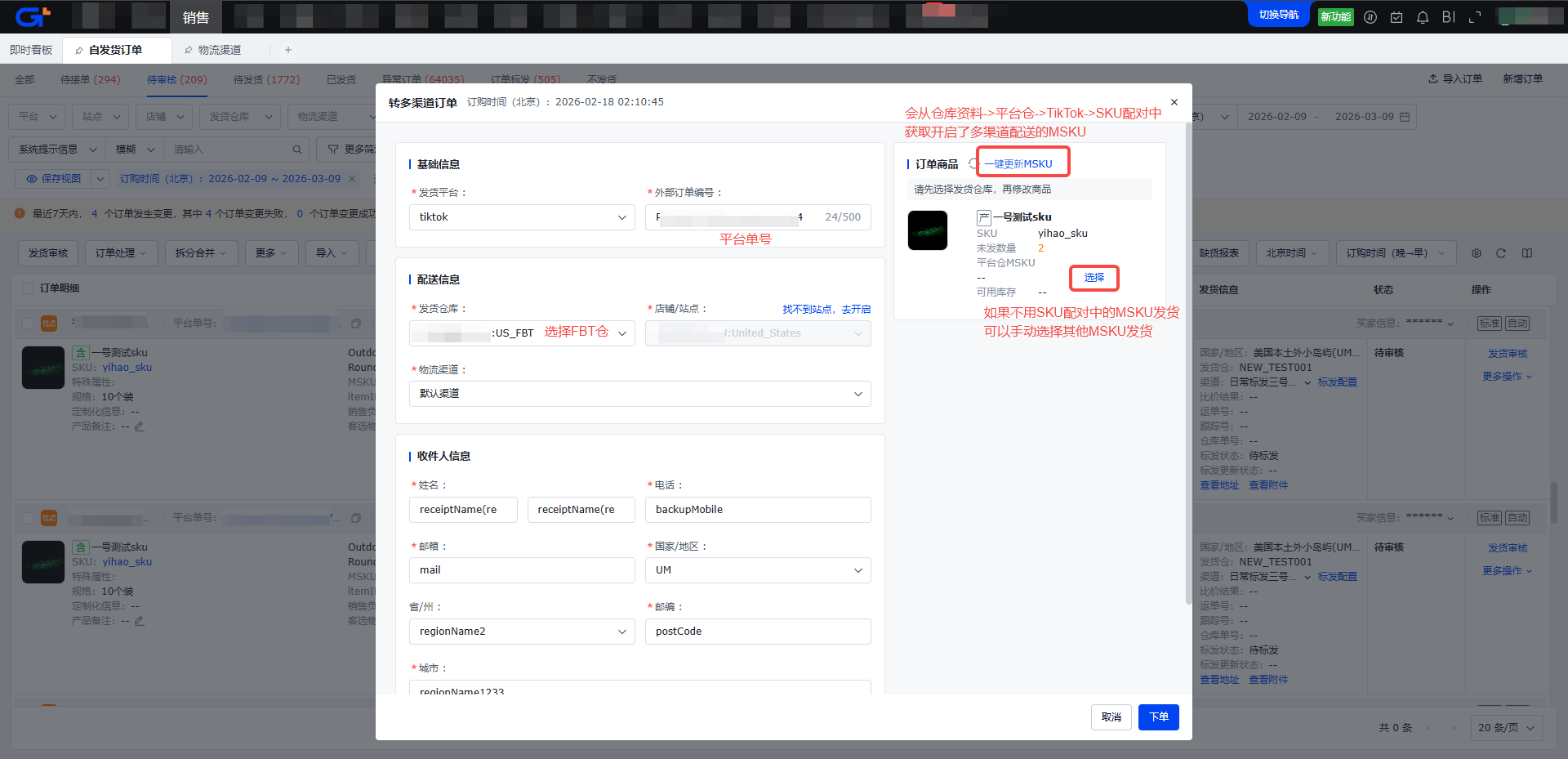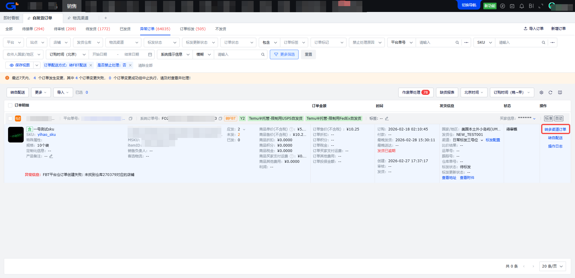 步骤二:点击操作栏中的【转多渠道订单】按钮,在弹出的页面中手动调整信息后,点击【下单】按钮,重新推送FBT仓